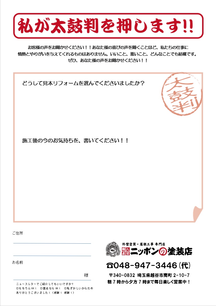 屋根と外壁のリフォームを考えていたところ、御社のチラシを見て友人の実家だと知った。相談に行ったところ、ていねいに対応してくださった。