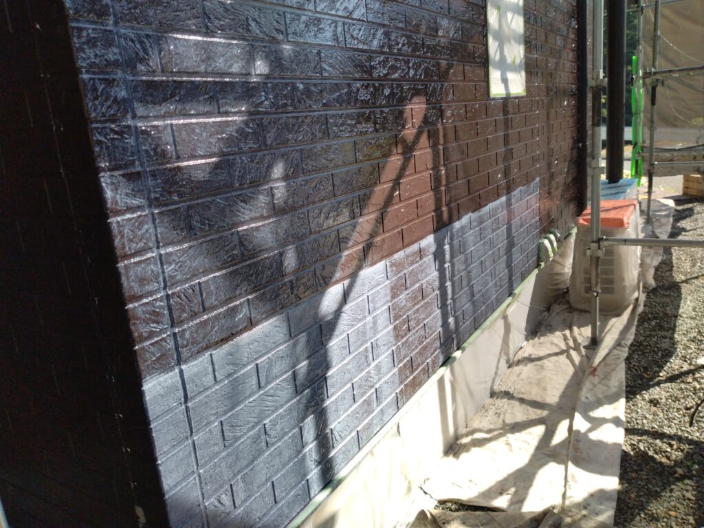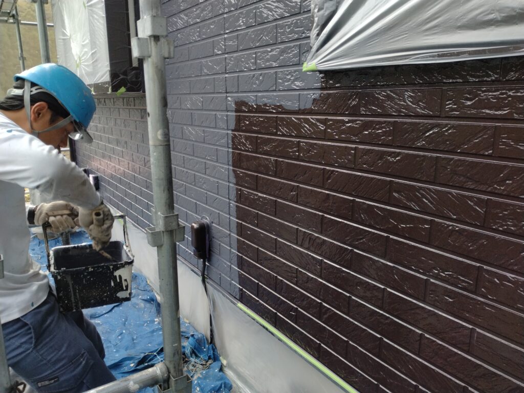 屋根塗装が完了したら、外壁の下塗りです。タイル調の凹凸部分が入りにくいので、しっかり確認しながら作業を進めます。