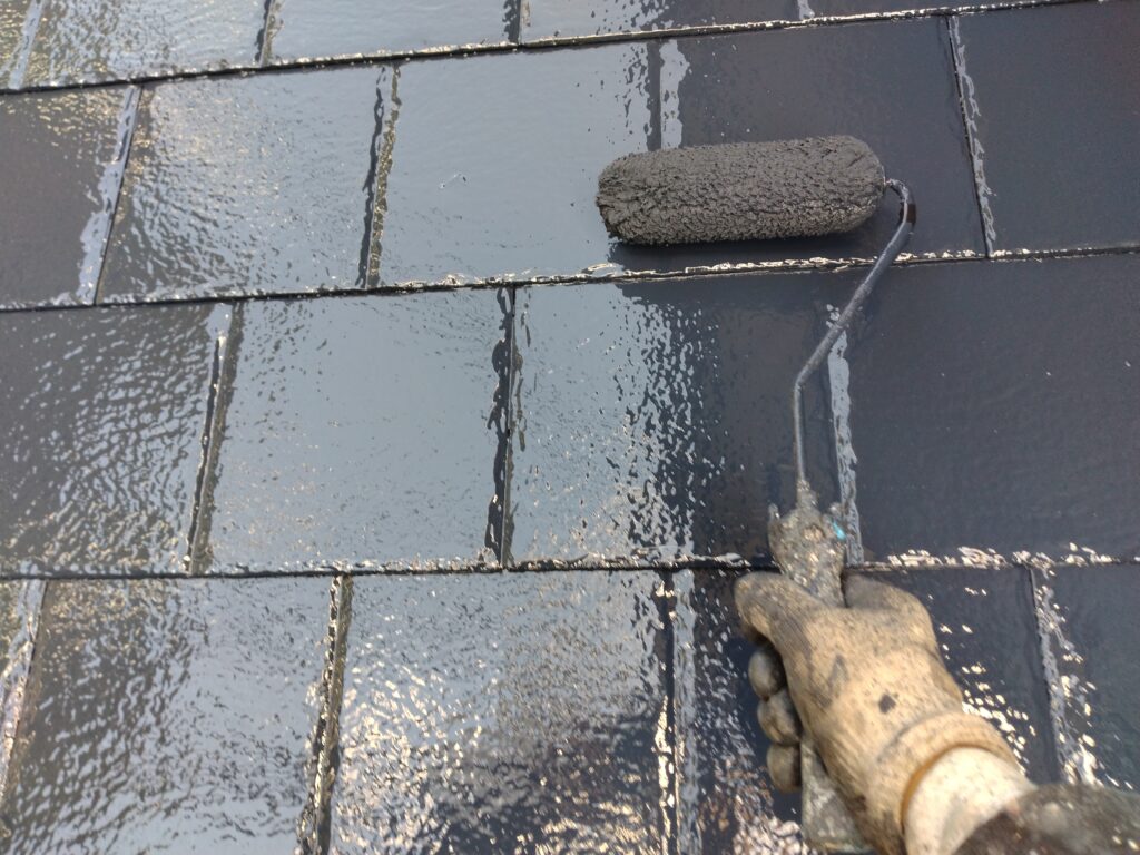 洗浄後、しっかり乾燥したら屋根の塗装から始めます。今回の塗料は専用下塗り材があり、着色も可能な製品となっています。色を3回塗ることが出来るため止まりも非常に良いですね。