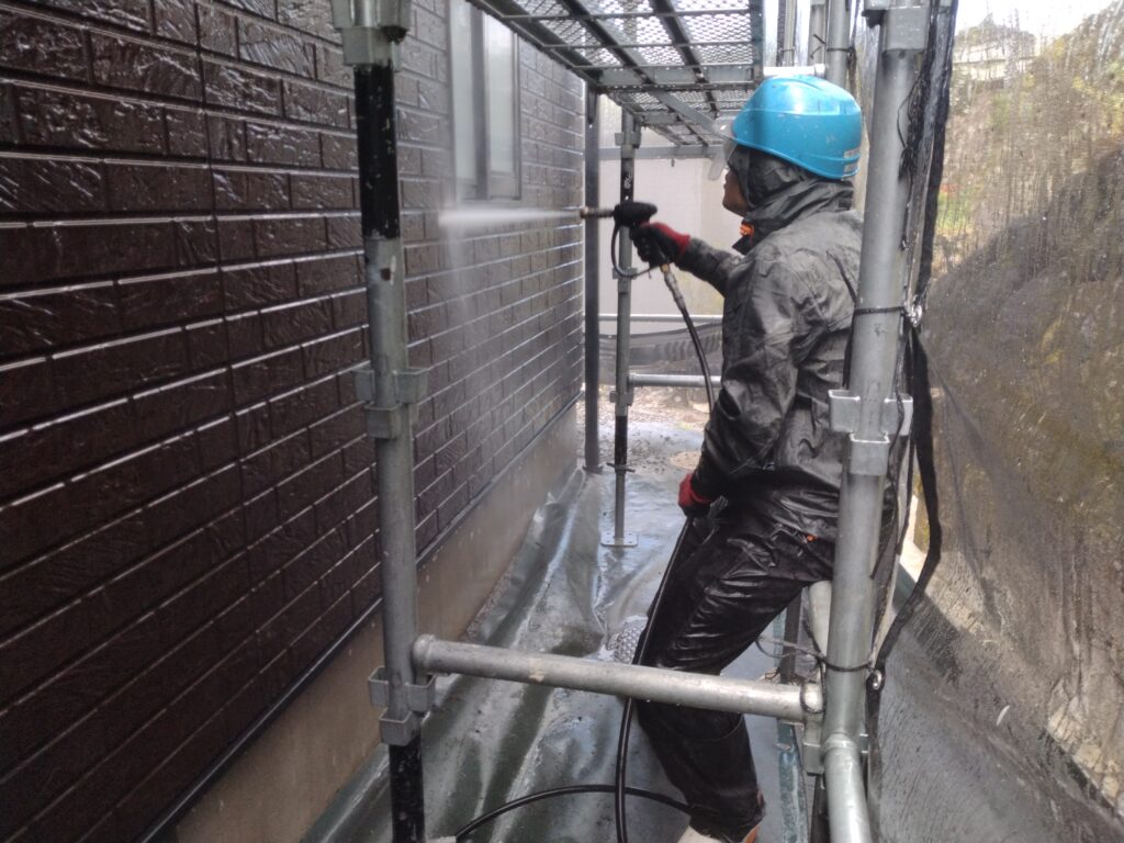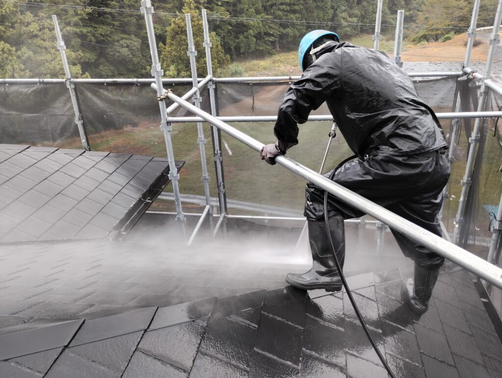 最初に高圧洗浄を行います。屋根→外壁のように上から順に洗浄して、汚れや苔、埃をしっかり落としていきます。苔が生えている屋根は滑るので特に注意しながら洗浄していきます。