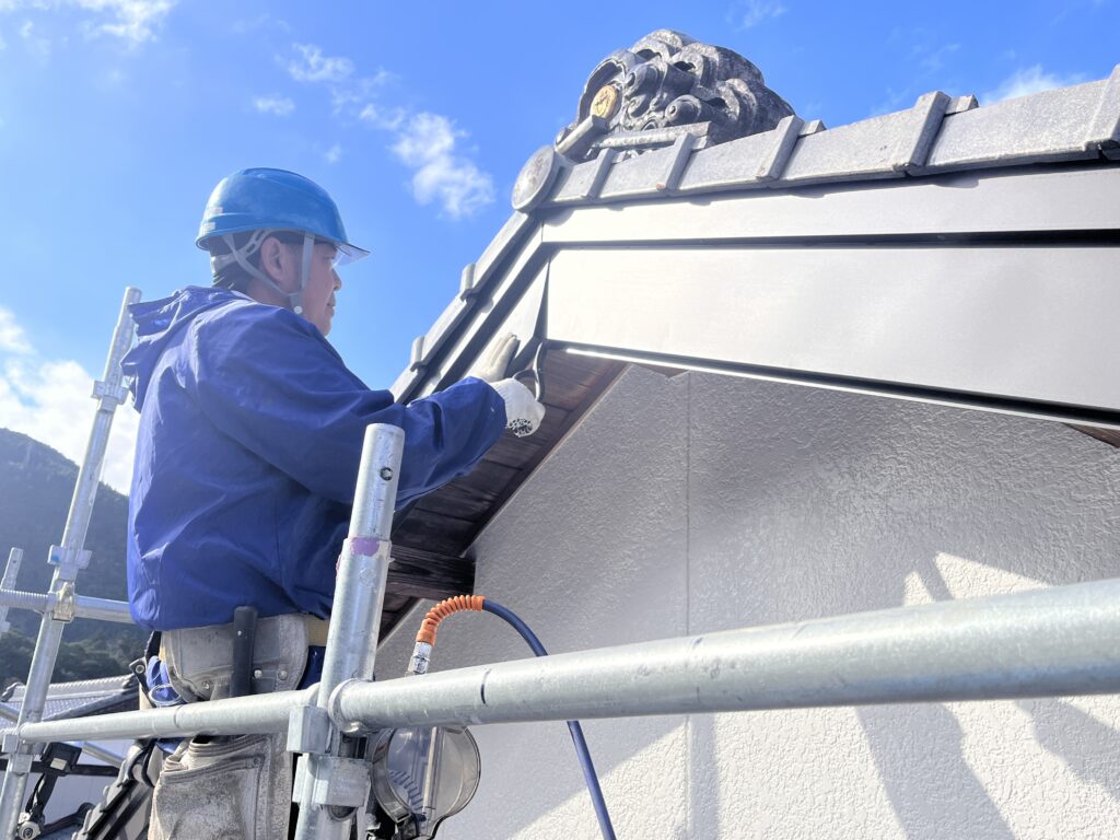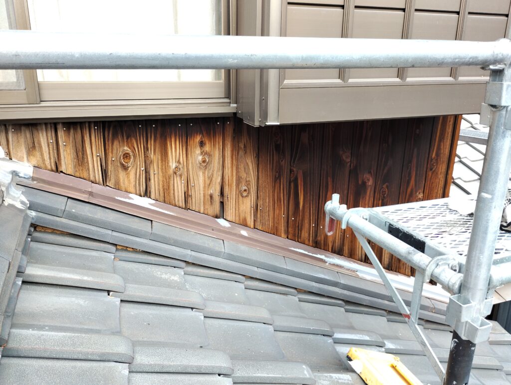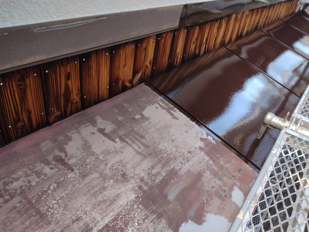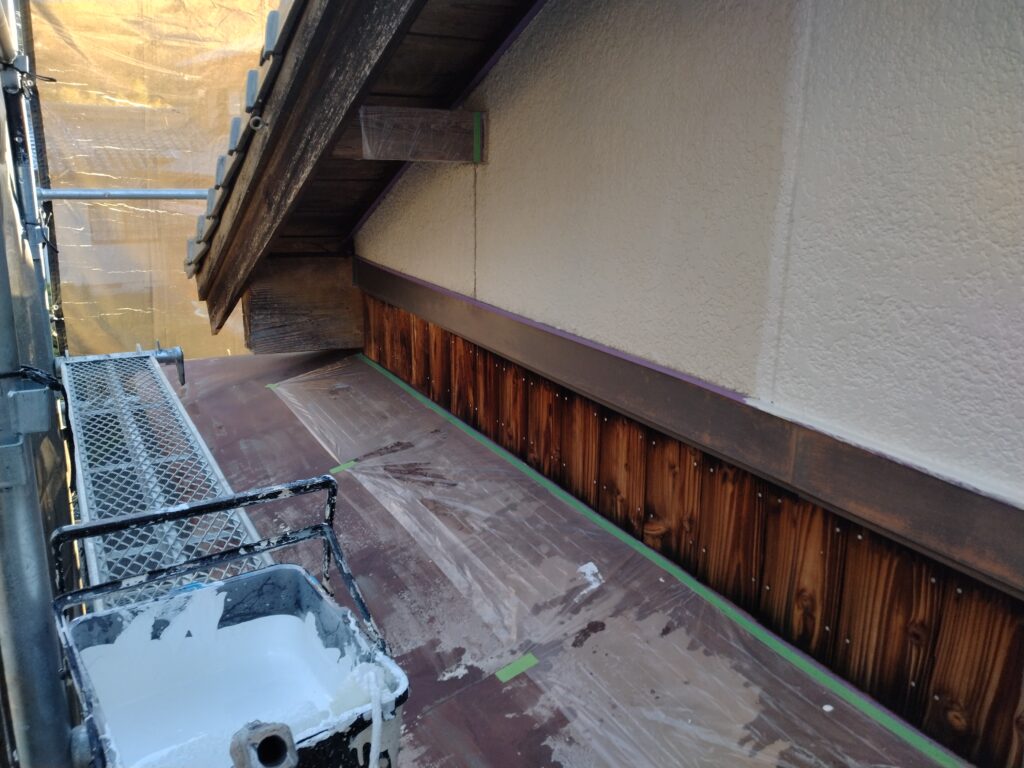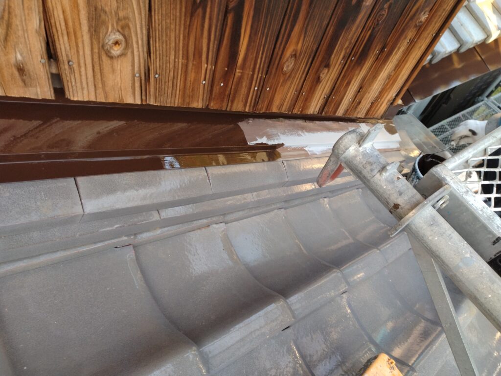 霧除けや水切りなど付帯部は、交換する雨樋に合わせてブラウンで塗装していきます。