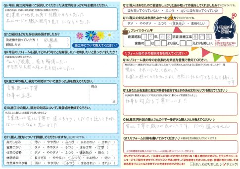口コミ評判チラシは見易くて、良いです。 カスタマーレビュー ★★★★★ Q.どうして奥三河外装を選んでくれたのですか? 1.地元の業者で信用できると思ったから。 2.チラシを見て真剣に仕事をされていると感じたから。 Q. リフォー...